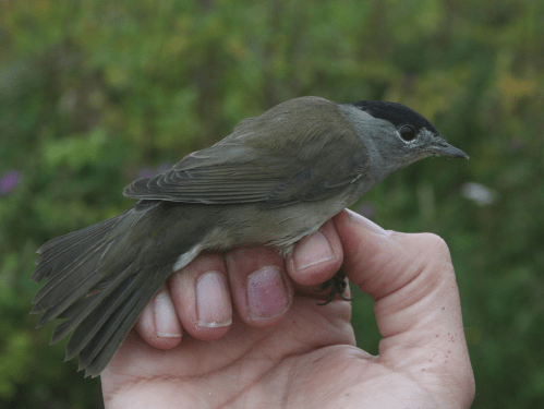 Before the post juvenile moult, Blackcaps cannot be sexed. This bird has completed the PJ moult and is clearly a male. However the pointed tail feather still allow it to be identified as a first year bird.