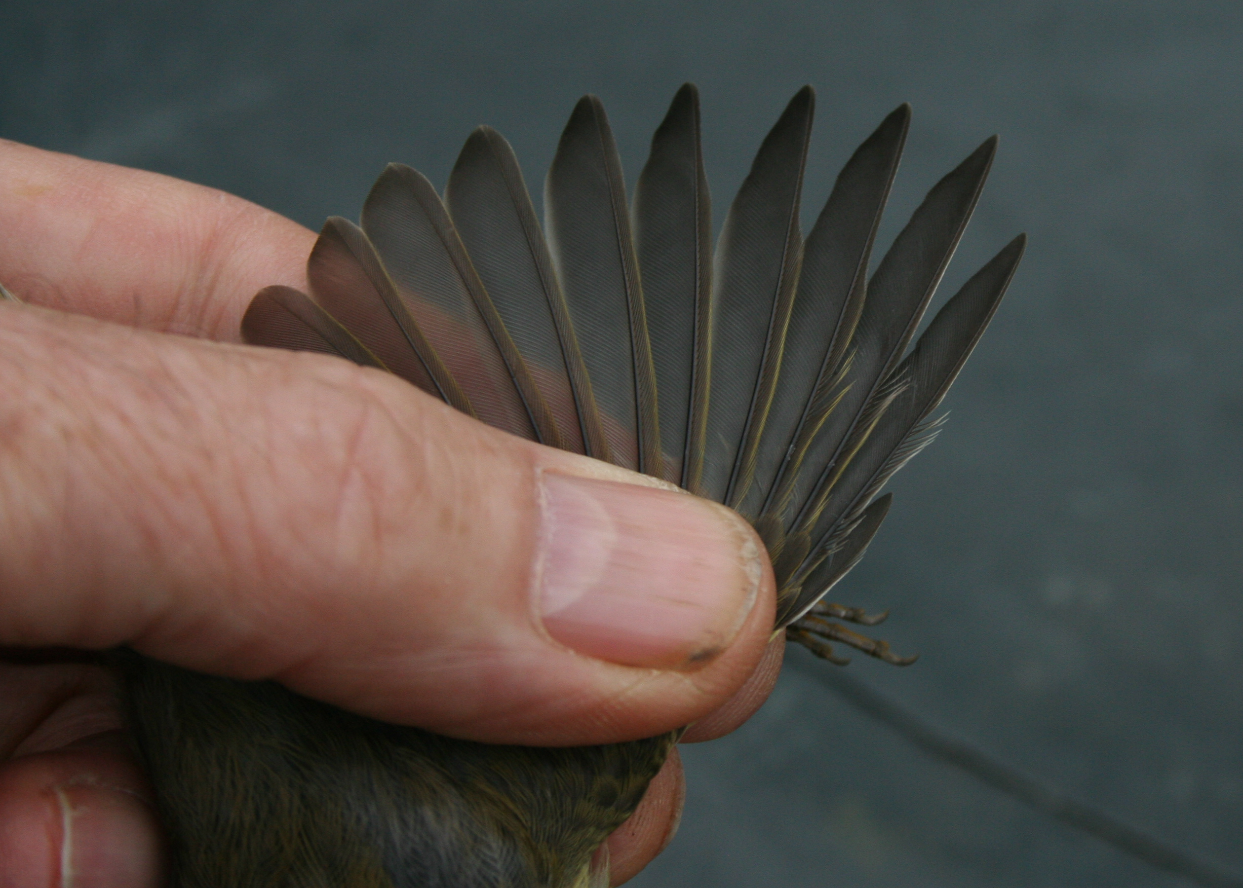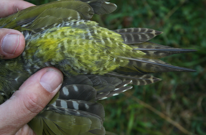 .... until we realised that Green Woodpeckers have a complex post juvenile moult which includes primaries, tail and most body feathers but not secondaries, tertials or primary coverts.