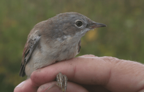 Adult Common Whitethroats have fresh plumage by August, like first years birds, so ageing is performed on eye colour (hazel brown) .......