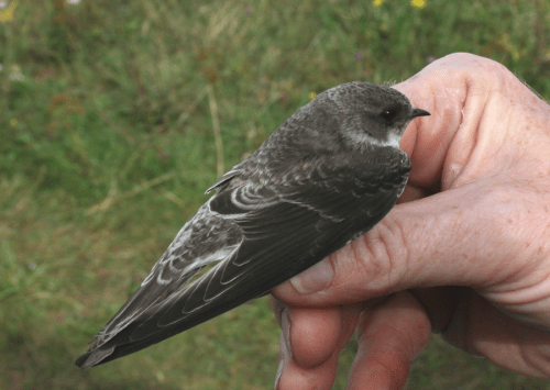 Pale tips to the tertials, upper tail coverts, wing coverts and mantle identify this Sand Martin as a first year.