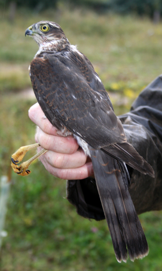 Sparrowhawks are unusual in that you have to sex them before you can ring them, as males and females taken different ring sizes. The brown tipped mantle and covert feathers and the pale yellow eye identify it as a first year.
