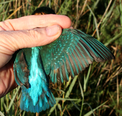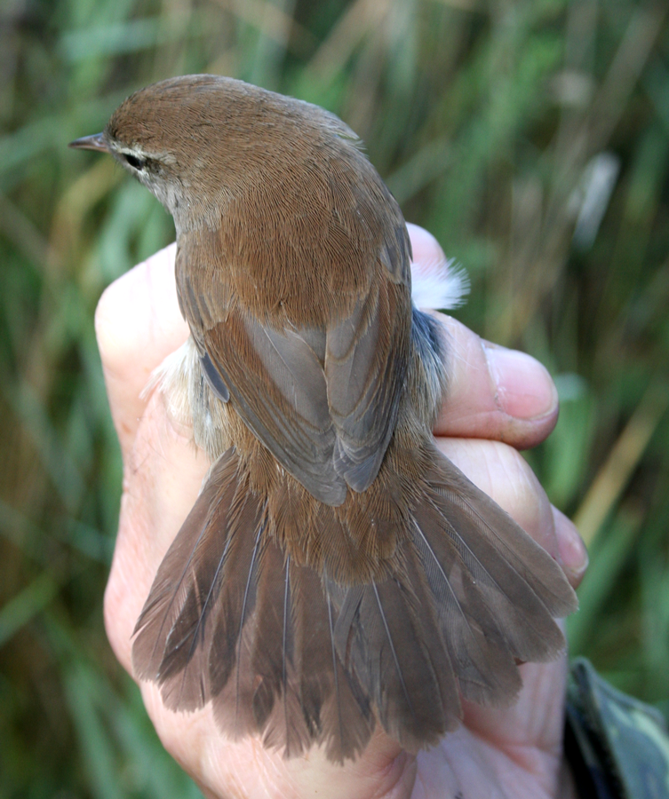 Not so many birds today, but an interesting mix, 2 Grasshoppers, 1 Cettis and another Kingfisher. Anyone visiting the Bay and seeing a Kingfisher on a regular basis would presume it was the same individual but as we have ringed 13 during July and August, with only limited retrapping, shows that there is a consistent migration of birds through the site.