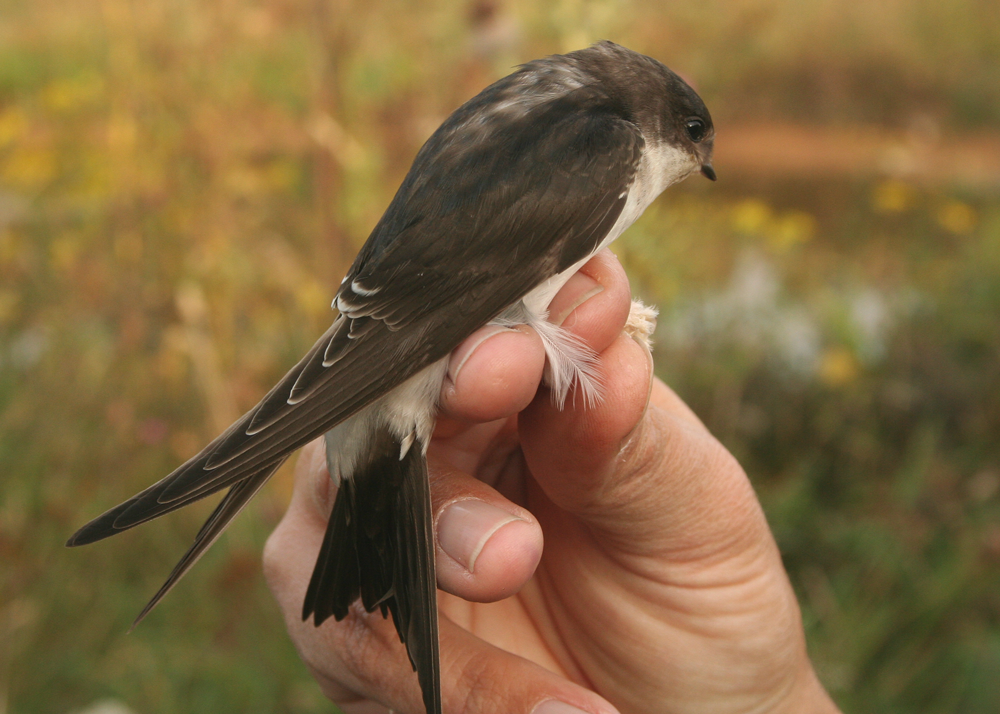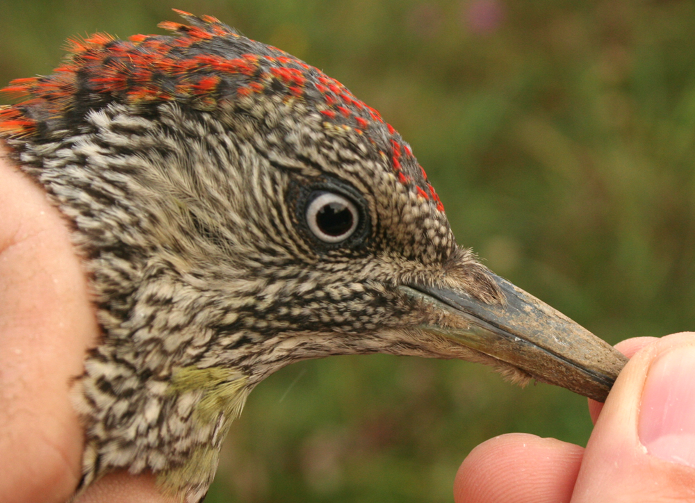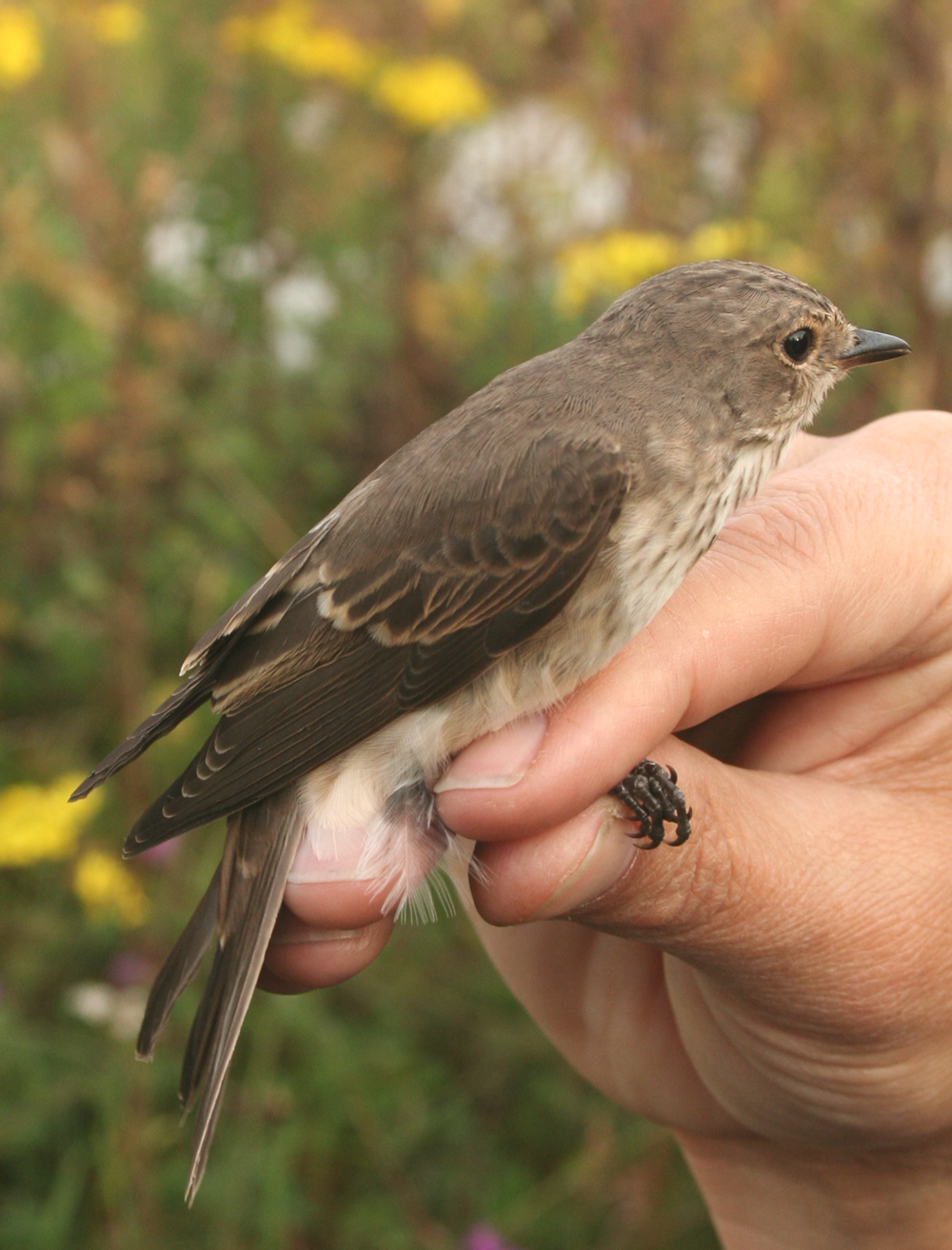 As there are plenty of tall trees near to where we ring, flycatchers seldom descend to net level. The fresh plumage and buff tips to the coverts identify this Spotted Flycatcher as a first year.