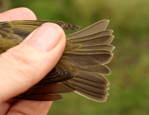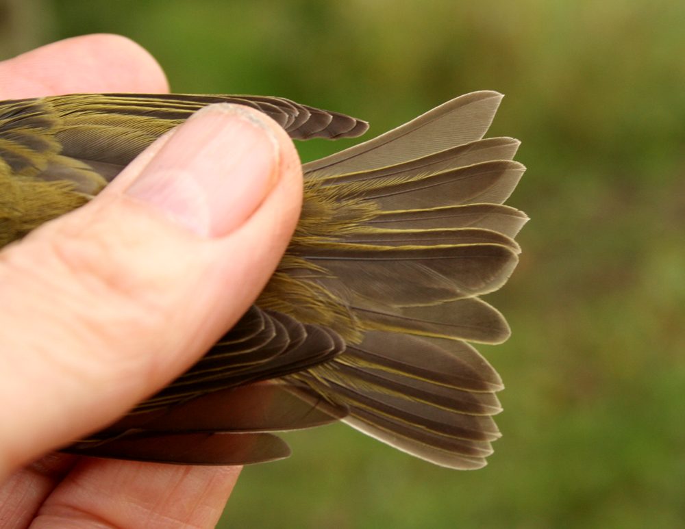 As they have a complete moult after breeding, ageing Chiffchaffs can be tricky, solidly dark and broad tail feathers with a lack of nicks (caused by abrasion in the nest) indicates that this is an adult.
