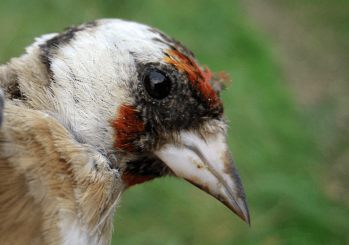 This is an adult Goldfinch undergoing the complete post-breeding moult. The blackish-grey rictal bristles and lack of red behind the eye indicate it is a female.