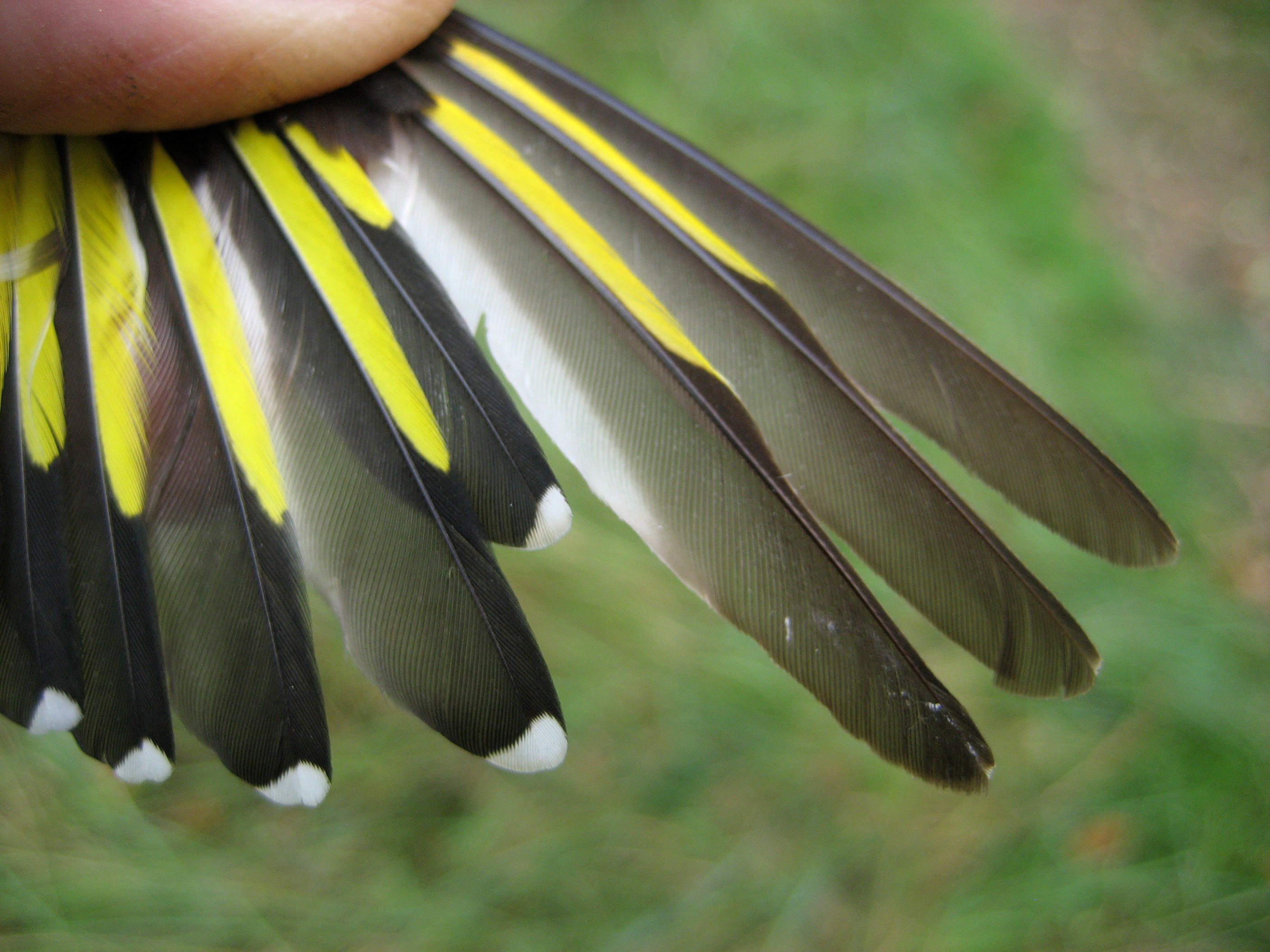 The wing of the same bird. The outer three primaries are unmoulted, the next is missing, the next is regrowing and the inner four have been replaced.