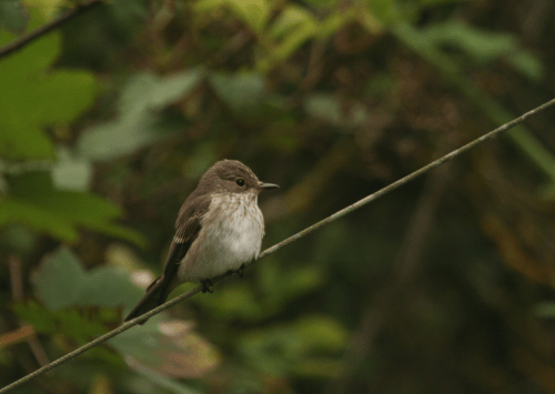 This Spotted Flycatcher is perching on the guy line a mist net in the Observatory garden