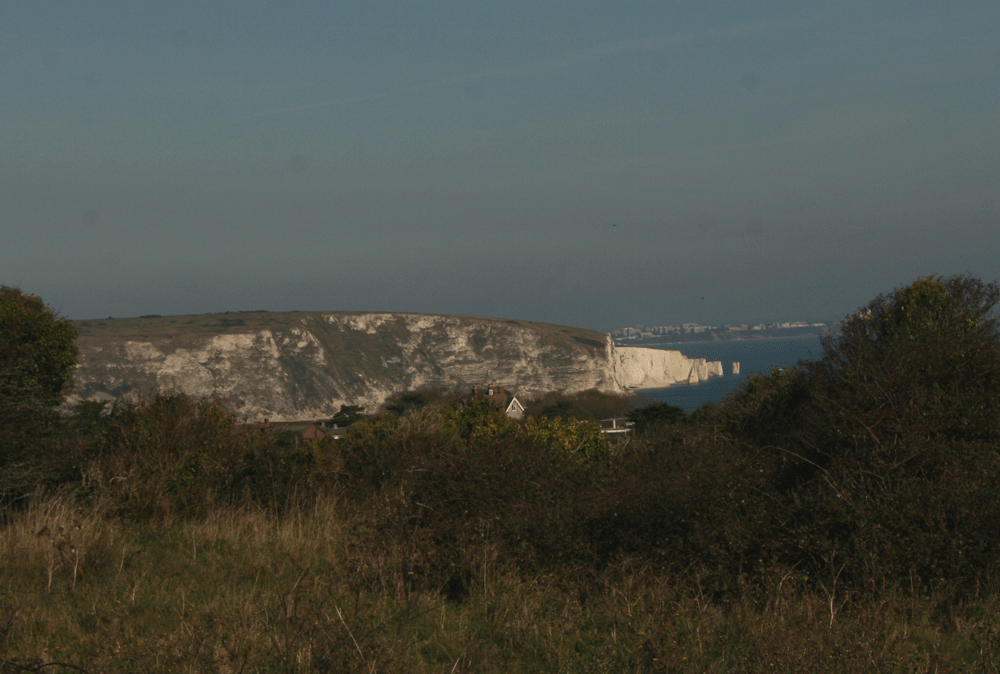 The view from most of the park is southwards out to sea or east to the Isle of Wight, but from the northern edge of the garden there is this great view northwards towards Ballard Down and Old Harry. Bournemouth seafront can be seen in the distance.