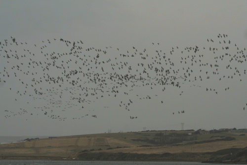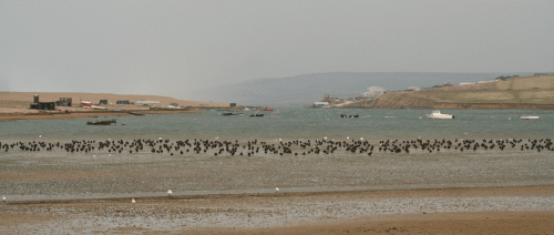 At nearby Ferrybridge a large flock of about 1500 Brent Geese had gathered. I had just got onto the rare but annual Black Brant when the whole flock was flushed by dog walkers. Black Brants are the eastern form, breeding in the Arctic from the east of the Taimyr Peninsular to Western Canada and are considered a full species by many, although the taxonomy of the Brent goose complex needs more study (one form, the so-called Grey-bellied Brent, has not even been formerly named).