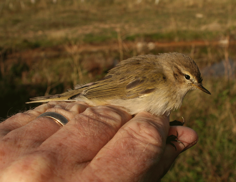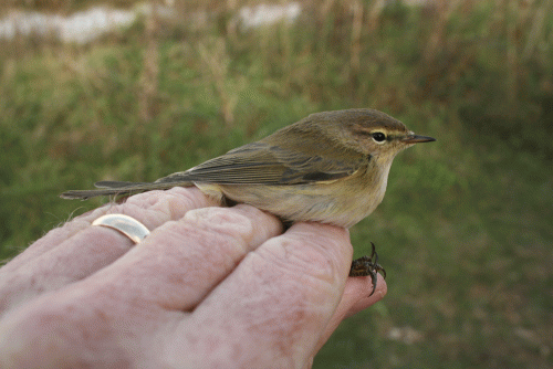 This pale Chiffchaff with green edging to the remiges caused lively debate. It is presumably of eastern origin, but not from as far east as the form tristis which has a wing bar and no olive colouration whatsoever.