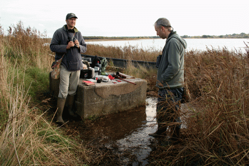 Garage ringing. Shaun and CarolrRoost ringing Pied Wagtails and Reed Buntings.
