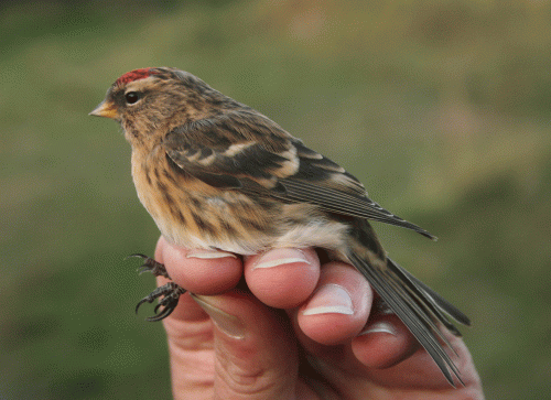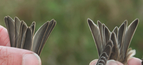 Redpolls can be aged on the shape and appearance of the tail feathers. Adult on the left, first winter on the right.