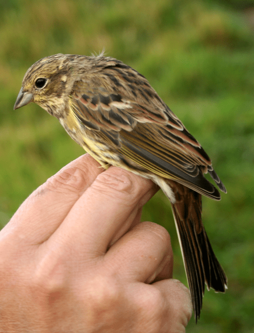 This first-year female Yellowhammer can be aged on tail shape and sexed by the pattern of the crown feathers. Like other buntings, breeding plumage is acquired through abrasion of the feather tips revealing the yellow colouration below.