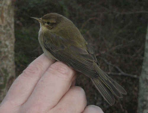 This bird trapped on 11 01 12 is our best candidate for a tristis but was heard to give a 'hoeet' call on release. Later it responded to tristis vocalisations