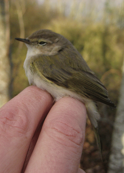 This pale Chiffchaff has very pale underparts and in the field might have been considered a candidate for 'Siberian' Chiffchaff but in the hand had some olive green in the upperparts