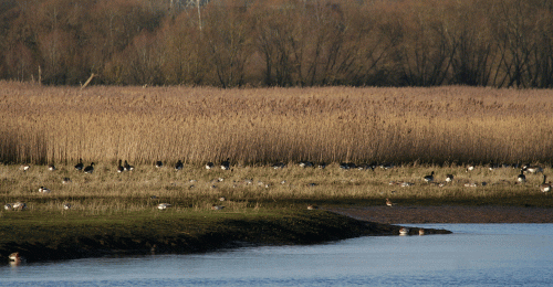 Lower Test Marshes, the White-front is in with all the Canadas but the 'small' Canada must be hiding in the reeds.