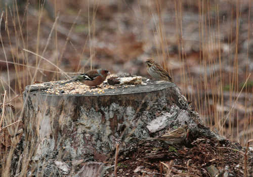 Chaffinches and Reed Buntings are feeding on grain put out for the Junco.