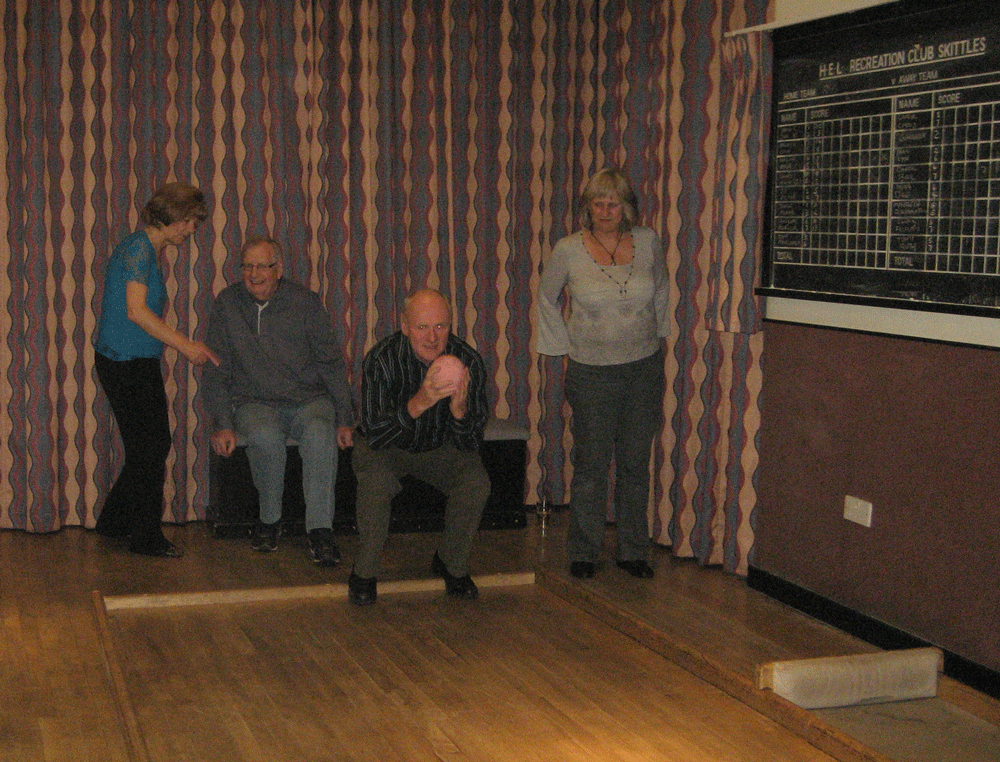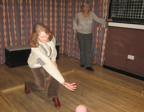Margaret uses the underarm bowling technique. Behind her Julia maintains the score..