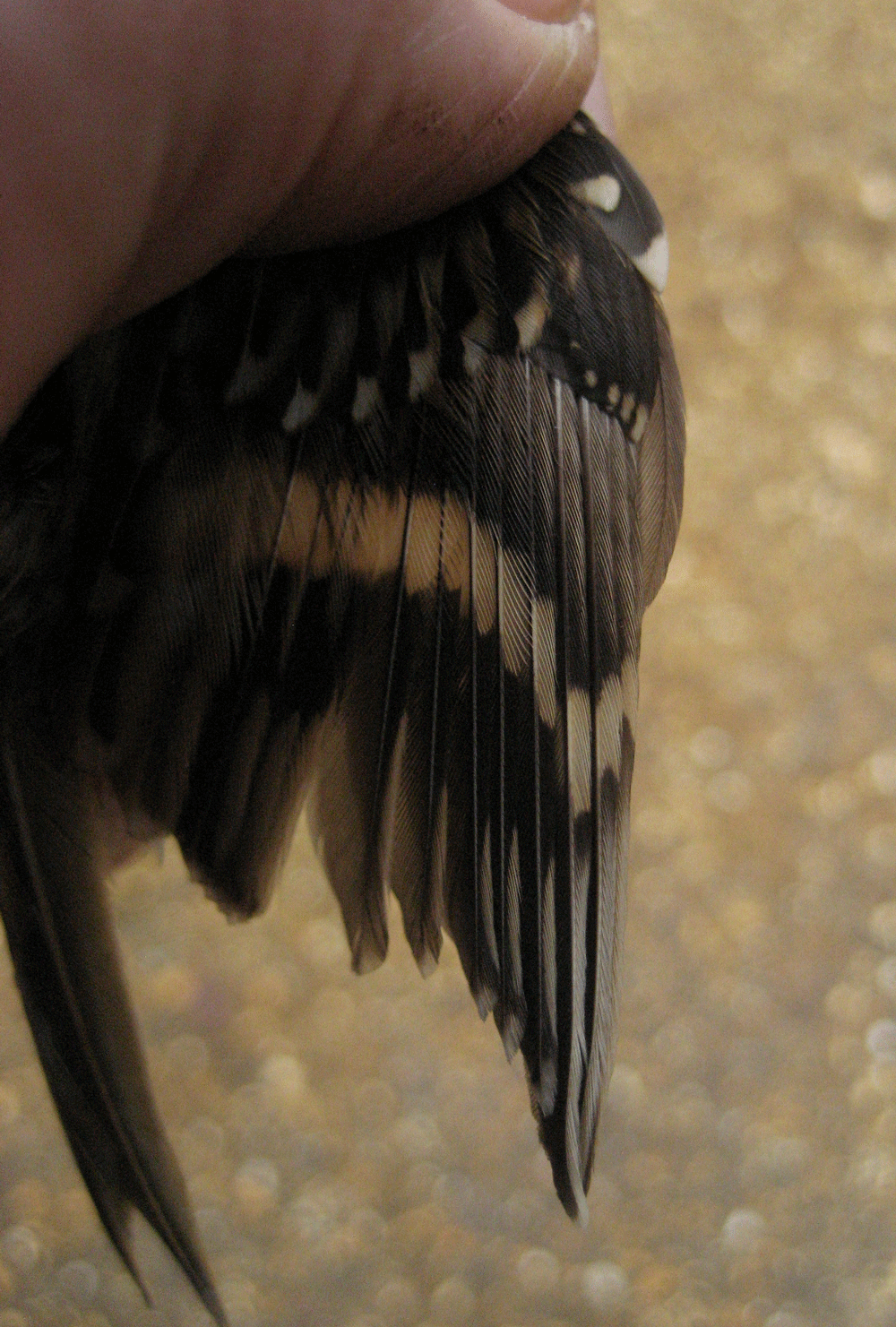 Common Treecreeper can be told from a vagrant Short-toed Treecreeper by the markings on the alula feather and the precise alignment and shape of the pale bar in the wing, especially on the longest primaries.