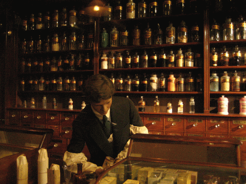 A mock up of a Victorian pharmacy .......