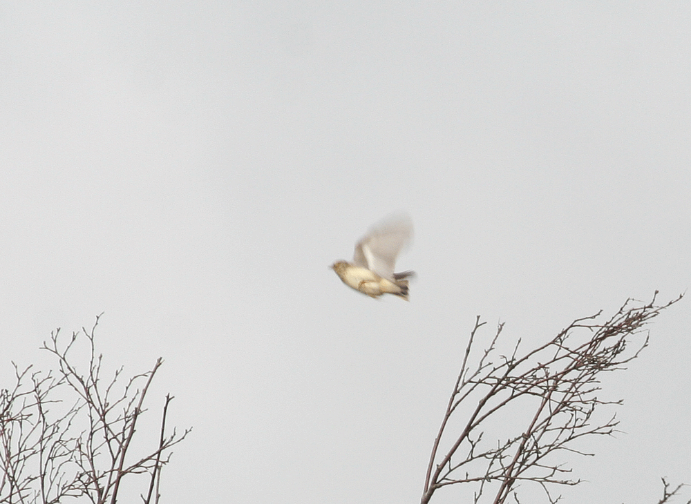 We left my house at 0515 and arrived at a group of fields outside Rhiwderin at 0740. The fact that it was ever discovered wintering in these unpreposing fields in the first place is remarkable. There were about thirty birders present and there was an awful lot of hedgerow to search, but we had only been there about 30 minutes when it was found. It took a while before it showed again but in due course gave good views.