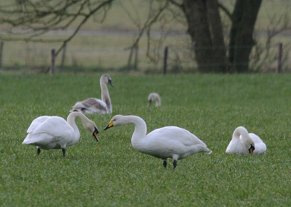 Two Bewick's at the back of the flock. This is our smallest swan with a neat, rounded yellow patch on the bill. The juveniles remain grey all winter unlike the blotchy moulting juvenile Mutes.