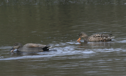 The drake Gadwall is a beautiful bird when seen well, with its black rear end and finely vermiculated neck and flanks. The female is reminiscent of a female Mallard but has orange sides to the bill and a white 'speculum' in the wing.