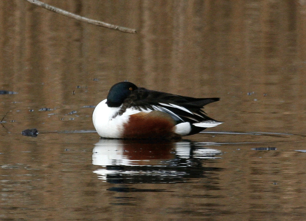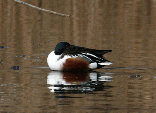 Even when the spatulate bill is hidden the drake Shoveler can be easily identified by its striking plumage.