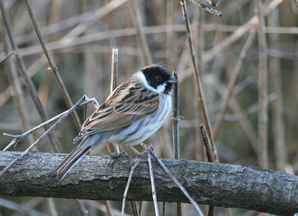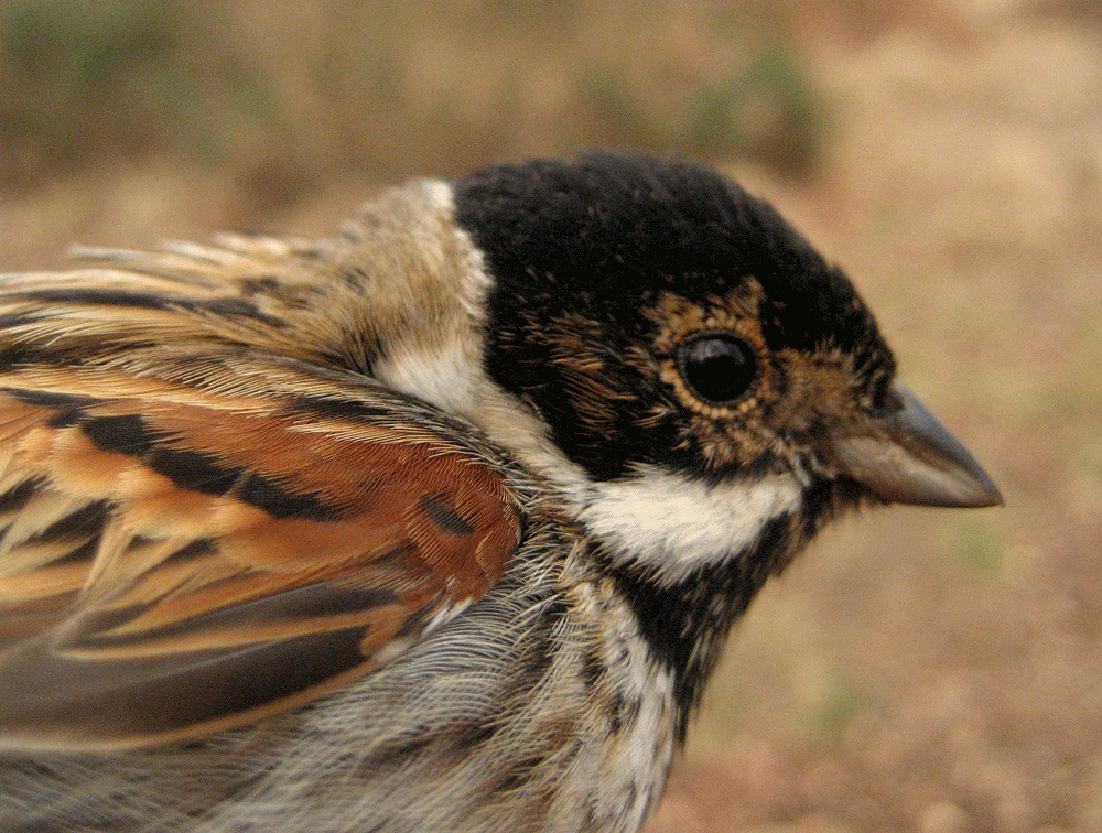 The breeding plumage of the male Reed Bunting is obtained through abrasion not moult. A few brown-tipped feathers remain around the eyes and the lores which should abrade to black very soon.