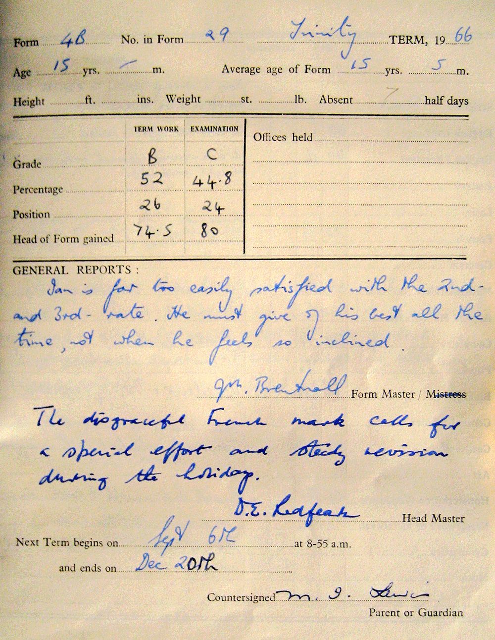 Simon has finally managed to clear Mum’s old house and has a whole lot of old paperwork to sort through. Amongst the old photos, recipes and receipts Simon found my school report, comments like ‘disgraceful French result’, ‘easily satisfied with 2nd and 3rd rate’ and ‘only works on subjects that he likes’ demonstrates that nothing has changed over the past 45 years!