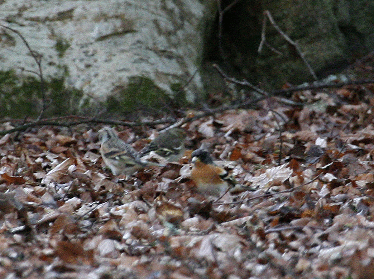 A female Brambling, female Chaffinch and on the right, a male Brambling, Bolderwood.