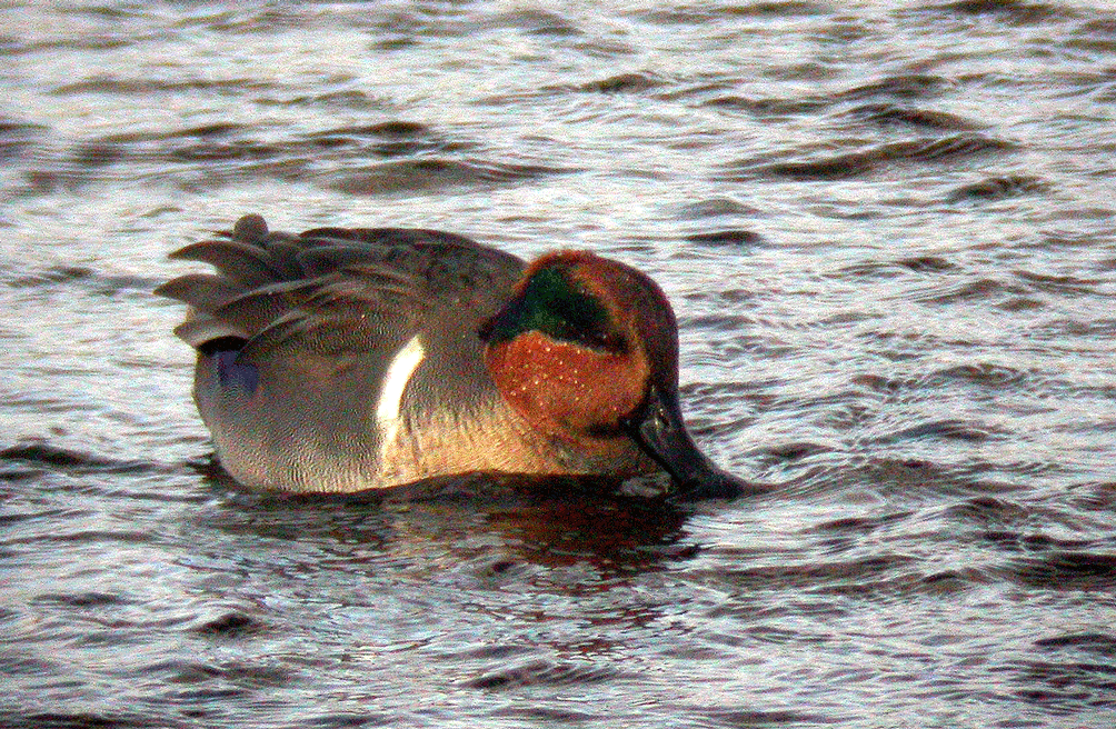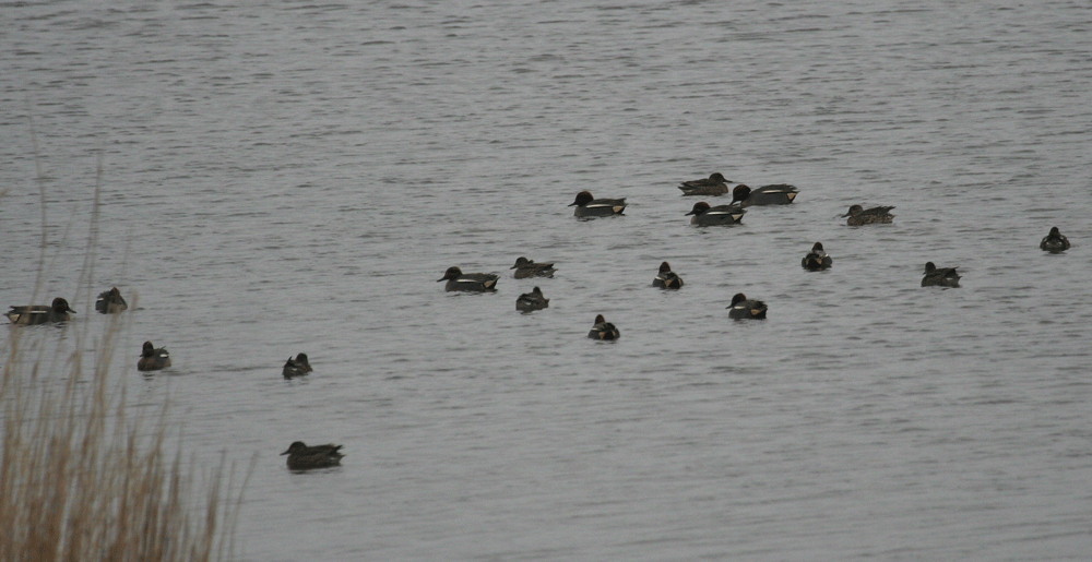 On the 9th Paul Morrison and I travelled to Farlington Marshes near Portsmouth in the hope of seeing a Green-winged Teal, the north American equivalent of our Common Teal. We arrived at 0815 but didn’t find the bird for four hours. We think it flew in on the rising tide as it was not present on our first circuit. Unlike the spring-like conditions of yesterday it was a cold and grey day but we were glad we managed we went and found this rare visitor from the Neartic.
