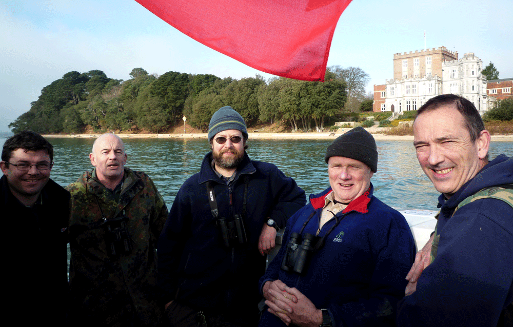 The boat back, Brownsea ringers: L-R Michael Gould, Bob Gifford, Sean Walls, me and Andy Welch with Terry behind the camera.