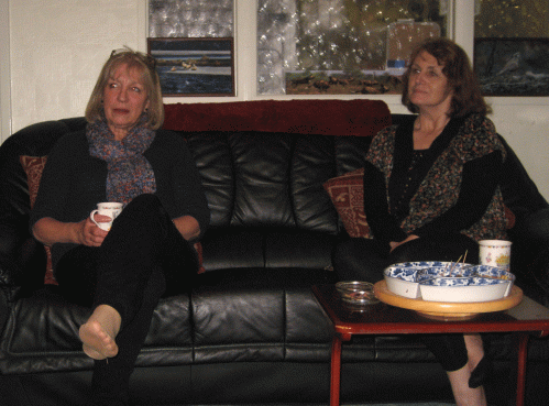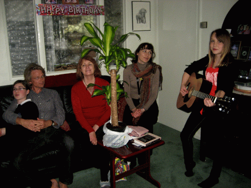 Kara had learned to play 'happy birthday' on the guitar especially for Margaret's birthday. The large plant is a present from Janis.