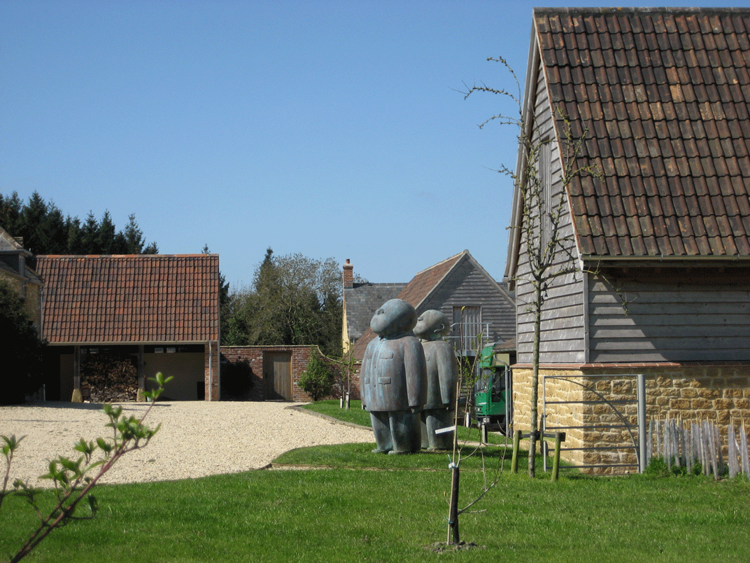 An isolated farm with some unusual garden ornaments.