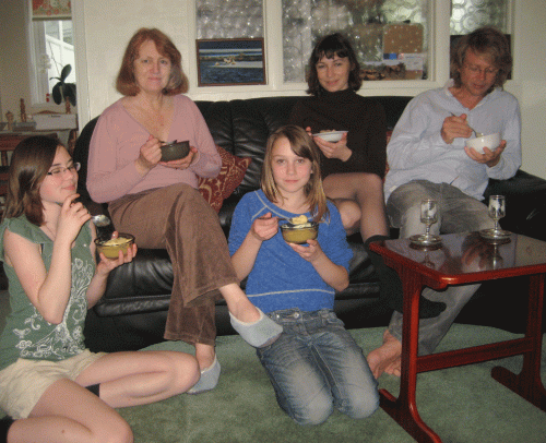 All of Monday was spent doing jobs at home. Janis, Andy, Amber and Kara, on hearing there was cottage pie and apple crumble on offer, came round for dinner.