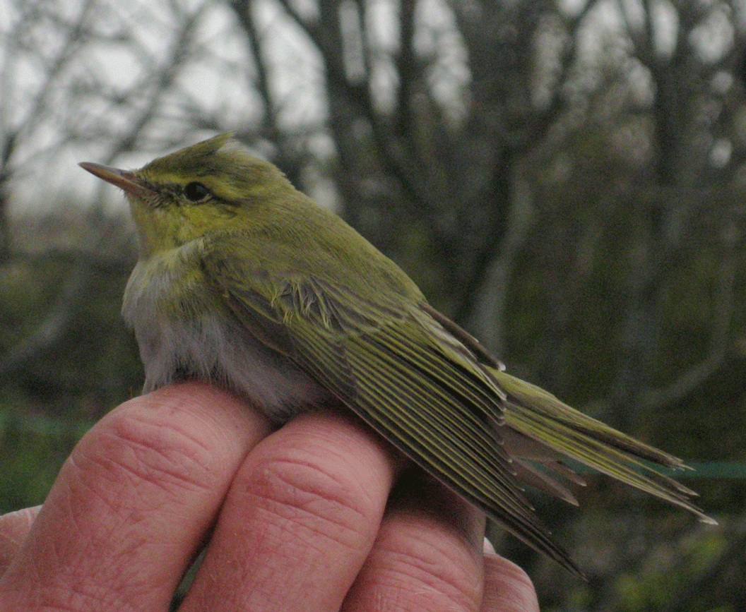Late on the 9th a vagrant Subalpine Warbler was found at Portland Bill (see http://www.portlandbirdobs.org.uk/) but I was meeting Margaret after work and decided to leave twitching it until tomorrow. On the 10th the weather at Portland was foggy, you couldn’t even see the sea from the Observatory and of course the fog horn blew all day. There was no sign of the Subalpine, although one person may have heard it near the Obs and another may have glimpsed it, however I had compensation in the form of a Wood Warbler that had been trapped moments before I arrived.