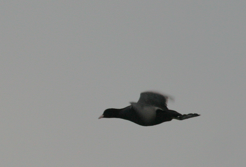 You seldom see Coots flying more than a few feet above the water. Large numbers arrive in winter but I have never seen any on migration.