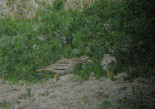 A pair of Stone-curlews take advantage of the fox proof enclosure. This poor digiscoped shot shows the distant pair with a single pullus between them.