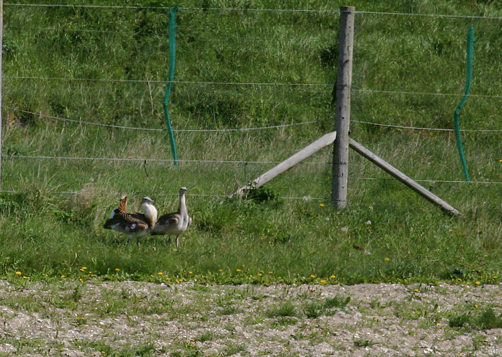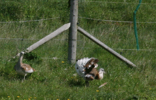 The release pen is not a cage, the birds are free to come and go as they please, but it is fox proof and the area is planted with the crops they prefer. There are also decoys to attract the birds, which are sufficiently realistic to cause the big male to mate with them. Currently five males, a five-year, a four-year and three one-year olds regularly using the release pen and can be seen from the hide that overlooks the area. It is hoped that most of the females are on eggs somewhere.