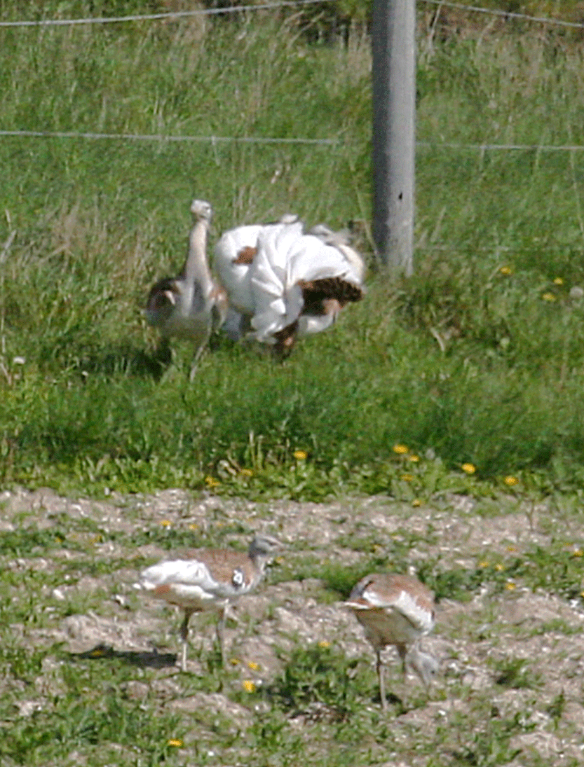 Although over 150 birds have been released over the last nine years less than 20 are known to still survive, although a few may occupy areas of the Plain that are completely inaccessible due to the high risk of unexploded shells. An 80% mortality is normal in wild reared populations mainly due to fox predation and the foxes on Salisbury Plain have taken their toll. Although several females have bred over the last few years it is not known if any young have reached maturity. One or two non wing-tagged individuals exist but they might be birds that have lost their tags. Several males have reached full size, about the size of a cock turkey, they at least are immune to fox attack.