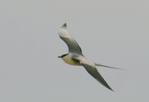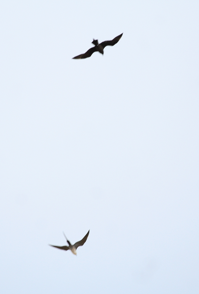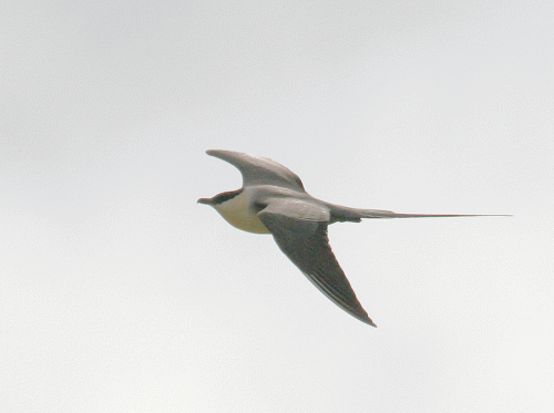 Easy to separate from the dark phase Arctic skua (top) in this photo, Long-taileds are harder to separate from pale phase Arctics, or when both are in juvenile plumage. Note the differences in structure in this photo and that juvs don’t have the long tail