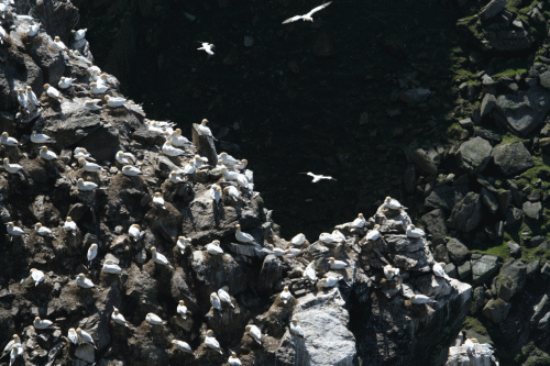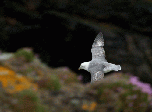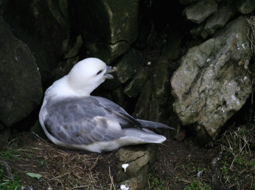 Fulmars nest in abundance on the rocky cliffs. They have a habit of spitting a foul-smelling oil at intruders as all seabird ringers and cliff climbers know to their cost.