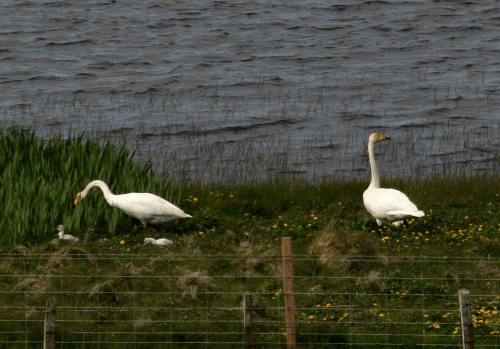 A few pairs of Whooper Swans nest in Shetland, the only location in the UK. Aggressive when breeding, they have been known to kill sheep that wander close to their nests. This pair had five cygnets, three of which are visible here.