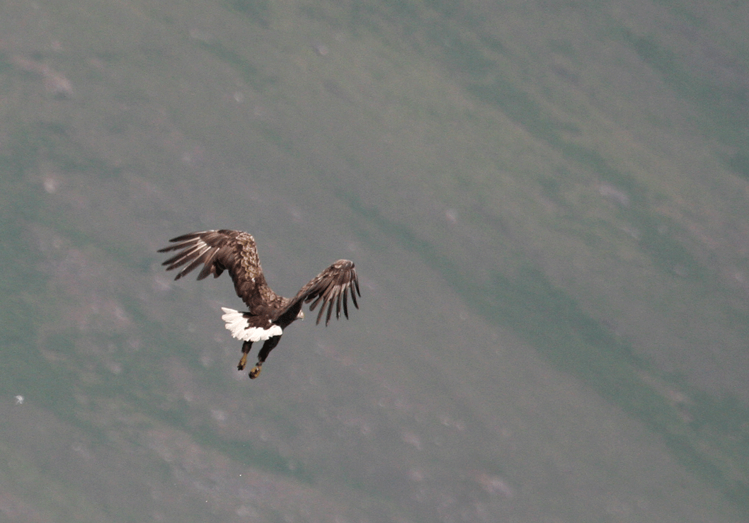 After giving poor views on the cliffs this White-tailed Eagle flew down to the sea, presumably investigating a fish …….