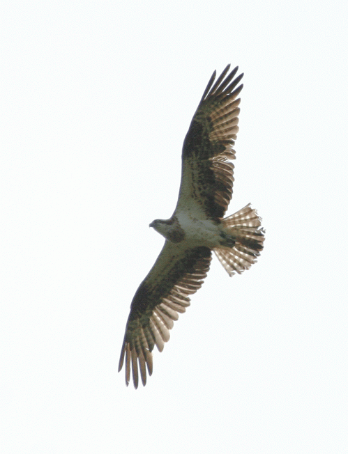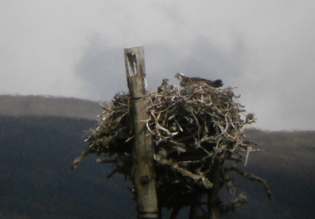 The same Osprey nest site has been used for the last 60+ years. In that time the nest has blown down, been robbed by egg thieves and the tree cut down by vandals. Today it is bolted together with metalwork and surrounded with electronic surveillance. The female Osprey and one of the three chicks can be seen in the digiscoped shot.