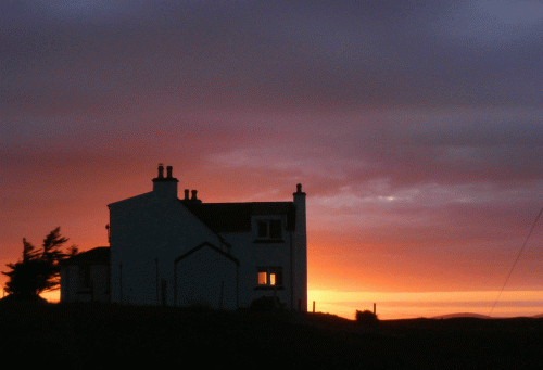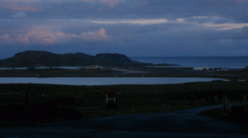 The residual twilight is known as the ‘Simmer Dim’ and lasts until the sun rises some time before 3. It is bright enough to read a book by. This is the view from Paul and Liz’s house over the Pool of Virkie and Sumburgh Head. The island of Fair Isle lies to the right just off the picture.