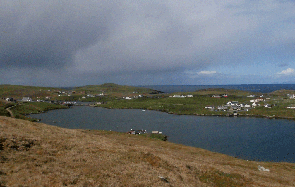 A typical Shetland view. Long sea lochs or voes, sheltered harbours and scattered houses.