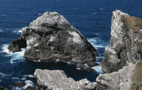 Notice the green tinge to these Gannet nests. This is caused by discarded fishing nets that the birds incorporate into their nests and often become entangled as a result.