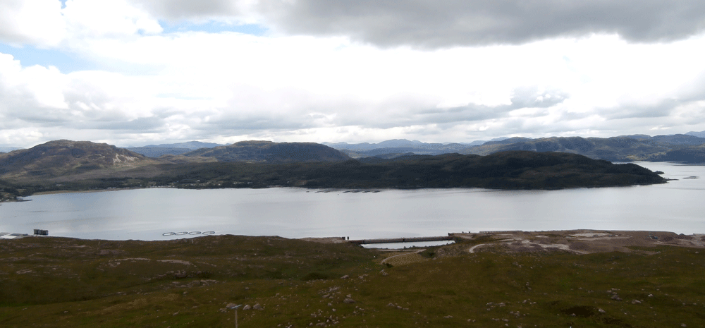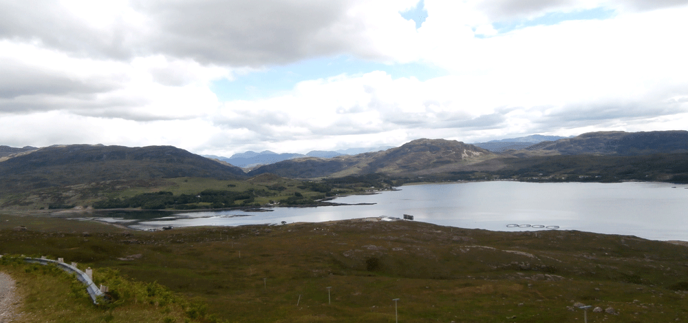 Below: 180 degree panorama taken in three photos from the top of the Applecross peninsula looking south over Loch Carron. Skye can be seen in the background to the right.